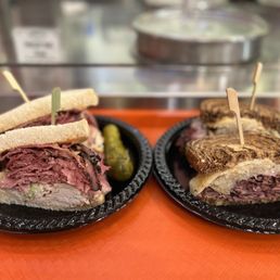 Greenberg's Deli Greenberg's Deli located in the New York-New York Hotel, is dope. The deli offers a cute theme reminiscent of a classic New York deli, which adds a charming touch to the overall ambiance. The service was impressively fast, which is always a plus when you're hungry and eager to enjoy your meal. The sandwiches were the highlight of my visit - they were not only delicious but also generously stuffed with meat, making each bite flavorful and satisfying. I tried the New York Skyhigh (16.95), which was packed with corned beef, pastrami, turkey, cole slaw, and Thousand Island dressing. The combination of flavors and textures was excellent, and it was quite filling. I also had Vinnie's Deluxe for (16.95) featuring beef brisket, turkey, pastrami, and muenster with deli mustard and mayonnaise. This sandwich was equally impressive, with the brisket and muenster standing out as particularly delicious components. Greenberg's Deli offers a great deli experience with its quick service, cute environment, and fantastic sandwiches.
